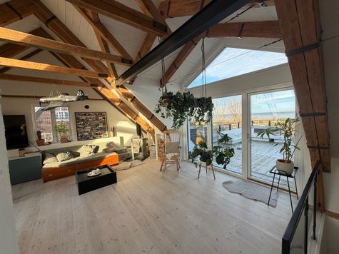Huset präglas av öppen planlösning, generös takhöjd och synliga takbjälkar, vilket skapar en varm och arkitektoniskt spännande miljö. Stora fönsterpartier och takfönster ger ett fantastiskt ljusinsläpp hela dagen.