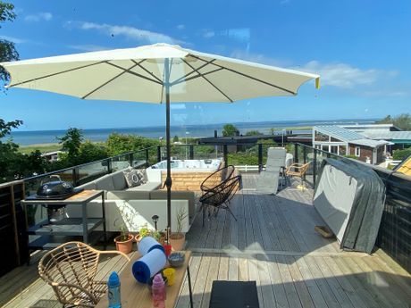 Huset erbjuder generösa terrasser i flera nivåer med glasräcken och fri sikt mot omgivningen: