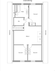 På ovanvåningen finns tre stycken sovrum med enkelsängar (105cm-120cm), ett vardagsrum samt ett badrum med toalett, dusch och badkar.