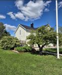 Stor trädgård med flertalet äppelträd och mycket gröna ytor, tillgång till grill finns.