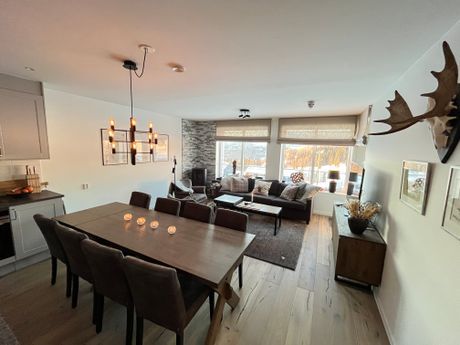 Lägenheten i nybyggda Högåsstigen 21A, med magisk utsikt mot Renfjället har 8 bäddar fördelade på 3 sovrum