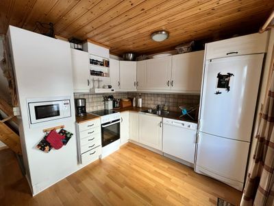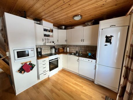 - Kök med spis, ugn, kylskåp, frys, diskmaskin, mikrovågsugn, kaffebryggare.