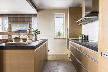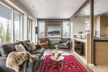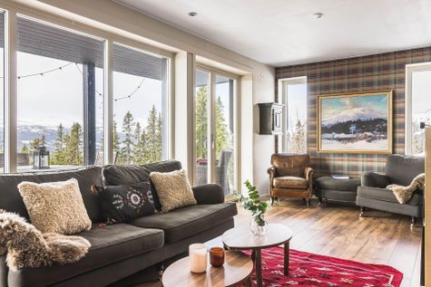 Åre Björnen: Rymlig och modern lägenhet om 90 m2 i bästa solläge (sydväst) med stora fönster ostörd utsikt mot Åredalen. Perfekt för den stora skidåkar/vandrarfamiljen. Njut efter en dag på fjället i det stora allrummet som har öppen spis, en väl tilltagen soffgrupp och inte minst ett stort träbord som alla kan samlas kring eller slå er ner ute på terrassen och njut av solnedgången över Åredalen.