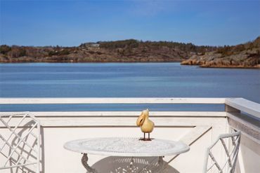 Stor uteplats (morgon- och kvällssol) med panoramautsikt över Malö Strömmar