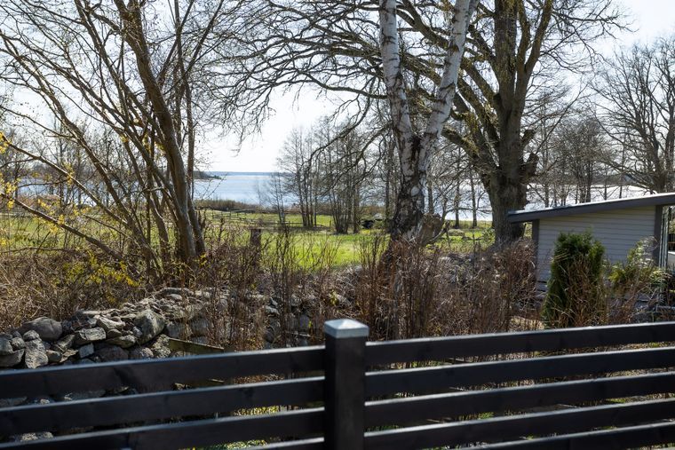 Här bor du lugnt och naturnära med badstranden endast 150 meter från stugan – som du ser från altanen.