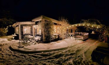 Barnsäng finns att låna. Samtliga hus har något form av tralldäck i framför huset,