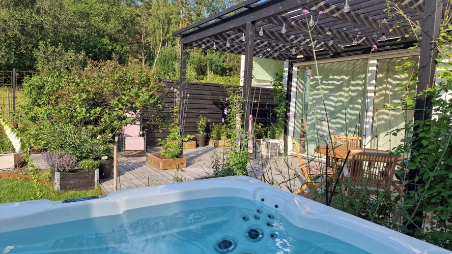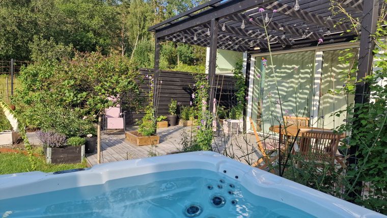 Du kan också välja att bara stanna hemma och njuta av lugnet. Trädgården vetter mot öppna fält och skog och ger en rogivande miljö. Här kan du koppla av i det varma utomhusspabadet, sola på terrassen eller ordna en härlig grillkväll under de långa svenska sommarkvällarna.