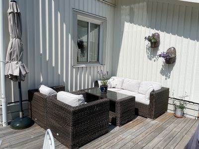 Altan i två väderstreck med sol morgon till eftermiddag (mindre soffgrupp och matgrupp och gasolgrill). Stor rymlig balkong under tak och med vindskydd med sol eftermiddag-kväll (här finns matgrupp och en soffa). Picknickbänk för barn finns att flytta efter behov.