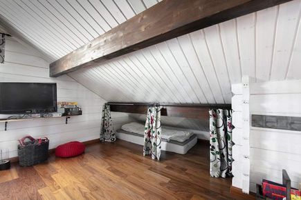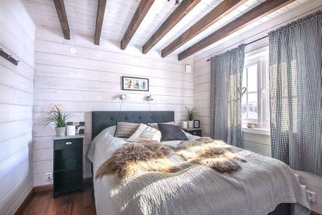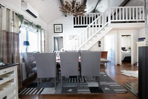 Stugan erbjuder 2 sovrum med dubbelsäng, ett barnrum med våningssäng, ett loft med enkelsäng som nås med stege och 2 stycken extrabäddar uppe vid vardagsrumsdelen en trappa upp.