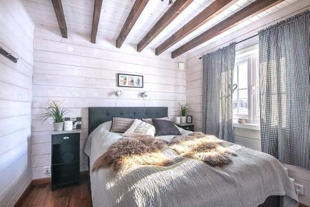 Här välkomnas du av en rymlig hall utrustad med golvvärme, ett fullt utrustad kök med de flesta bekvämligheterna, braskamin, samt ett stort och luftigt badrum.