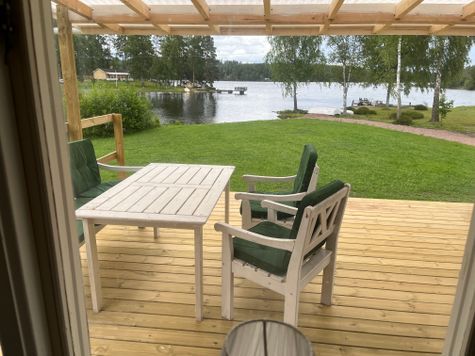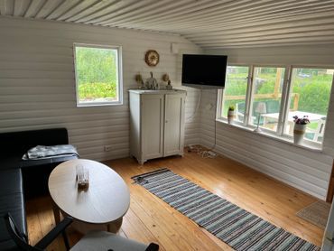 Från den övertäckta altanen har ni en underbar utsikt över vattnet – en härlig plats för morgonkaffet, kvällsgrillningen eller bara för att sitta ner och njuta av stillheten. Inne i stugan möts ni av ett mysigt allrum med öppen spis och en bekväm bäddsoffa. Det lilla köket är funktionellt utrustat med bänkspis, ugn samt kyl/frys – allt ni behöver för att laga goda semester¬måltider.