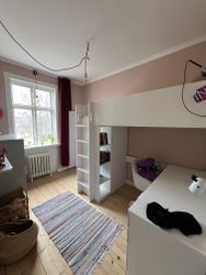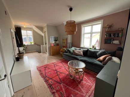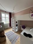 Övervåning: Allrum. Tre sovrum: nummer 1 med dubbelsäng (210 cm). Nummer 2 med 120 säng. Nummer 3 med loftsäng (extra säng/madrass kan placeras på golv). Badrum med dusch och badkar.