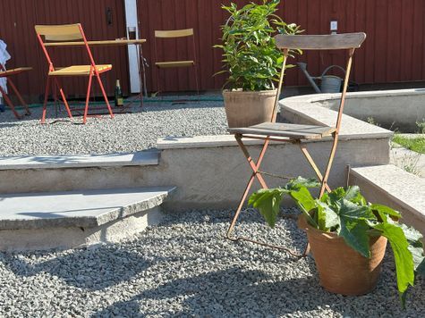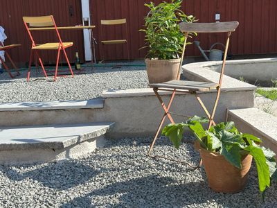 Kring stugan finns en grusad terrass på femtio kvadratmeter som du har full tillgång till själv. Den erbjuder både sol och skugga. Här äter du frukost till solens pigga morgonstrålar. Här kan du koppla av i bekväma solsängar eller svalka dig en stund under heta dagar. Här laddar du också energi inför kvällens begivenheter.