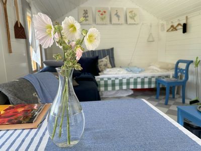 Next Door ligger på samma tomt som vår bostad. Trädgården är naturligt avgränsad mellan de båda delarna. Det betyder att du även har tillgång till en gräsyta framför stugan för till exempel kubbspel, mölkky eller boccia om du gillar det. Tvättlina finns på plats mellan de gamla fruktträden för att hänga upp badkläder, handdukar eller kanske din tvätt på tork.
