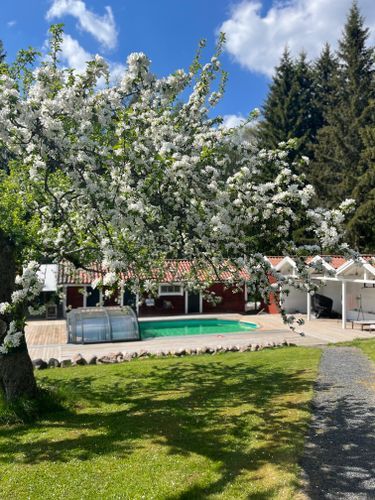 Vårt hus Mossen liggen i natursköna Finspångs kommun nära allt men ändå lugnt på landet. Det finns en uppvärmt saltvattenpool (9x4m), vedeldad bastu, två altan under tak (en till morgonkaffet och en till kvällsgrillning). Huset ligger i ensamläge, det är bara en äldre dam (min mamma) och våra höns som du delar tomten med. Poolen är under tak och går att låsa. Det finns dock inget poolstege. Njut av lugnet i vårt stora trädgård (4000m), sitter vid lägerelden eller tänd en brasa inne i huset. Du far njuta av färska ägg som du kan hämta direkt från våra höns.