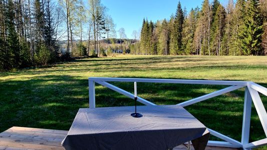 Vacker terrass med en fantastisk utsikt över den stora ängen och skogen. Sjön glittrar genom buskarna och nås till fots på bara några minuter.