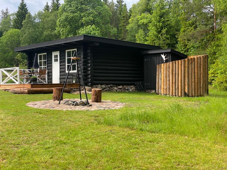 Toaletthuset (med modern torrtoalett med separering) samt uteduschen (kallt vatten) ligger precis bredvid timmerhuset.