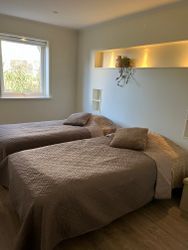 Ett sovrum med två 90-bäddar, sedan finns även en bäddsoffa i vardagsrummet för två personer!