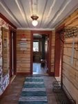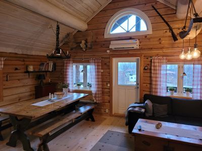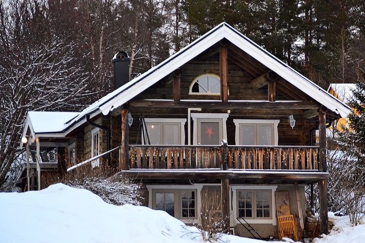 Das Haus ist eine Blockhütte aus groben Stämmen erbaut, mit einem gemütlichem