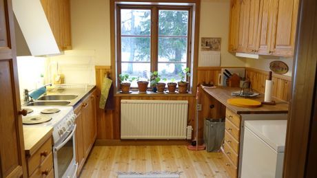 Das Holzhaus hat zu ebener Erde eine Wohnstube mit Kamin, Küche und