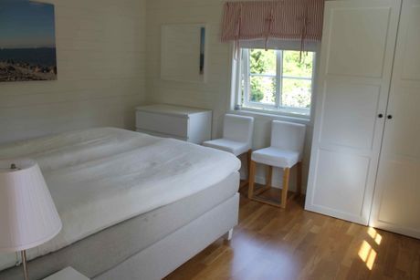 Ett sovrum med kontinentalsäng (160x200cm), garderob, byrå samt 2 sängbord. Bäddsoffa (bäddmått 140 cm) finns i allrummet. I allrummet finns även TV med basutbud och hemmabiosystem. Ni får tillgång till DVD-filmer och pocketböcker under er vistelse hos oss.