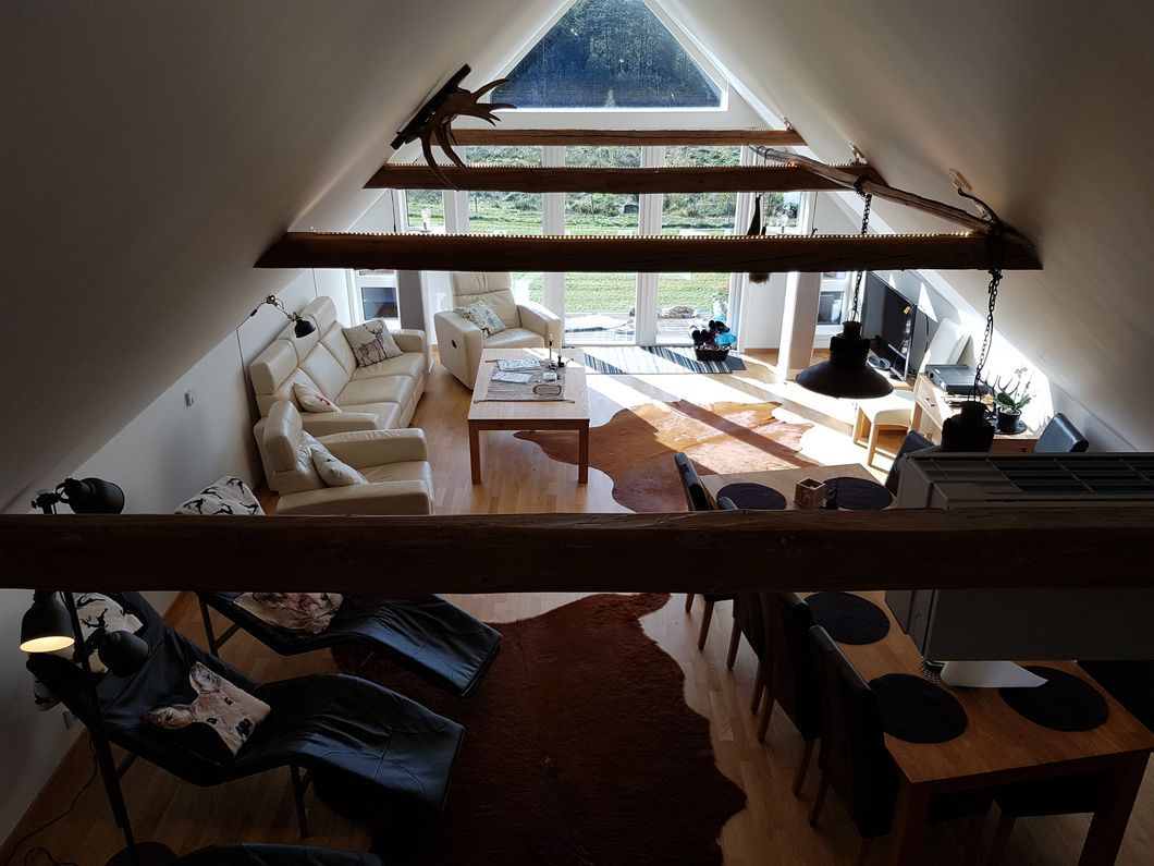 The apartment can house a maximum of eight people, with the possibility to add a couple of beds upon request. Two of the bedrooms consist Queen Size beds, while there is a loft with the remaining four single beds. There are two bathrooms with a shower each to meet our guests presumably wishes to keep fresh scented, and a well equipped kitchen to make it as available as possible to stay well fed during your holiday. In the spacious living area there are plenty of room for our guests to hang out. You could all cuddle up in front of the TV, spread out a boardgame across the dining table or just relax with a good book in one of the lounge chair. On particularly warm summer evenings (or any evenings really..) the great balcony makes a perfect spot for drinking wine, coffee or other liquids of your choice. If you are lucky, which we are pretty often, you might even be able to spot a deer or two, or ten, from up there!
