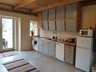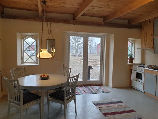 Sie wohnen einfach in einem Zimmer im alten Stall. Schöne Fenster ergeben zusammen mit verputzten, dicken Kalksteinwänden, verputztem Betonboden und Holzdecke ein schönes und harmonisches Ambiente. Im Zimmer gibt es vier Betten, wovon zwei tagsüber als Sofa funktionieren, Esstisch mit 4 Stühlen und Küche. Durch die verglaste Doppeltür in Richtung der Morgensonne, kommen Sie hinaus auf einen möblierten Außenplatz mit Grill. Die Vegetation in Flügelnähe besteht aus Rosen, Weide und Gemüseland. Die Küche, mit Strom und Wasser, ist gut ausgestattet. Plumpsklo aussen. Geduscht werden kann draussen in der Aussendusch in der Fliederlaube oder im Wohnhaus, wo es auch ein WC und eine Waschmaschine gibt. Ein Trampolin gibt es auch.
