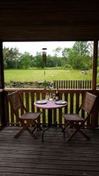 Das Ferienhaus hat eine große Terrasse, mit Tisch und Sofa sowie eine Dartscheibe. Hier kann man sich an warmen Sommerabenden aufhalten. Auf dem Hof gibt es auch ein Spielhäuschen mit vielen Spielsachen sowie ein großes Trampolin, das von vielen Kindern sehr geschätzt wird. Gartenmöbel und Grill sind auch vorhanden.