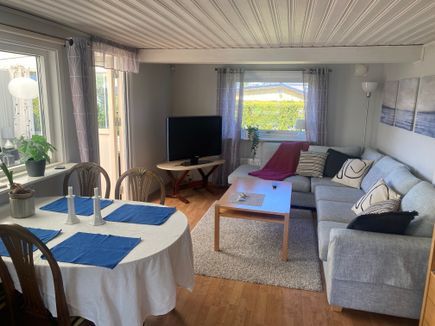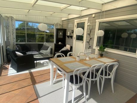 Denna fina och fräscha stuga har ett attraktivt läge med endast 150 meter till Farhults populära och vidsträckta sandstrand.