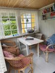 An den Eingang grenzt ein sonniger Westbalkon mit Gartenmöbeln. Der Eingang zum Haus erfolgt über eine charmante Veranda mit Glasflächen und gemütlichen Korbstühlen. Eine Küche mit Essbereich und ein Wohnzimmer mit Schlafsofa sind ebenfalls im Erdgeschoss gelegen. Außerdem eine kleine Toilette sowie ein separater Raum mit Dusche und Waschmaschine. Im Obergeschoss befinden sich zwei Schlafzimmer mit jeweils zwei Betten. Insgesamt verfügt das Haus über 4 Betten und ein Schlafsofa und das Gästehäuschen auf dem Grundstück hat 2 Betten und Kleiderschränke. Parkplätze stehen neben dem Haus zur Verfügung.