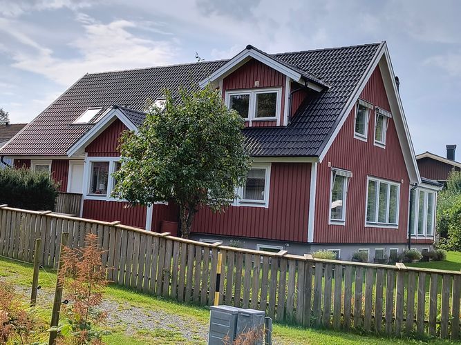 Välkommen att hyra mitt hus. 3 sovrum på ovanvåningen, varav ett med dubbelsäng. Bad med toa finns också där. På bottenplan finns ytterligare ett sovrum med dubbelsäng och TVrum med stor soffa som även kan bli femte sovrum. På tomten finns en mindre stuga med dubbelsäng och värme.