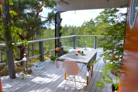 Ein von einem Architekten gezeichnetes Haus (133 m²) mit Seeblick sowie hohe, abgeschiedene Lage auf einem großen, wunderschönen Naturgrundstück. Drei möblierte Terrassen in verschiedenen Richtungen und eine Dachterrasse mit herrlichem Blick über Wald und Meer.