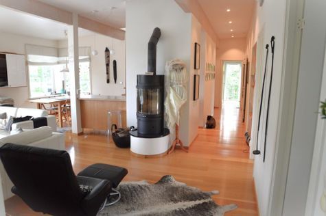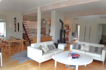 Das Haus ist hell und geräumig und offen gestaltet mit große, raumhohe Fenster und verglaste Schiebetüren. Großzügiges Wohnzimmer mit Sofagruppe am Panoramafenster und einem bequemen Sessel vor dem Kamin (Holz inklusive). Der Raum verfügt über einen geräumigen Essbereich für bis zu 8 Personen. In einem Schrank befindet sich ein Fernseher, der beispielsweise auf die Sofagruppe ausgerichtet werden kann. Gut ausgestattete, moderne Küche mit Barbereich.
