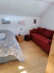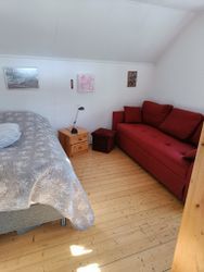 • Das Haus bietet 4–6 Schlafplätze: Doppelbett im großen Schlafzimmer oben, Einzelbett im kleinen Schlafzimmer oben