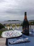 Wohnzimmer mit Ecksofa, Sesseln, Esstisch für bis zu 12 Personen und herrlicher Südlage mit Blick aufs Meer. TV und Stereoanlage. Offener Kamin (Brennholz kostenlos inklusive). Kostenloses WLAN vorhanden.