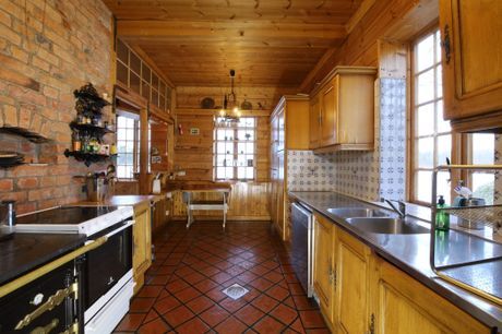 Downstairs there is a large room with wooden walls and teracotta floor. And also a french kitchen with wooden hatches and delft tiles..