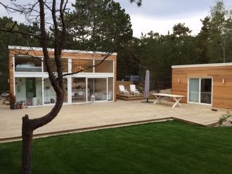 Exclusive summer accommodation in Åhus Aspet, consisting of a main building and a disposable guest cottage. The property is located within walking distance (250m) to Revhaksstranden in Ahus. The main building consists of complete kitchen with stove, microwave, dishwasher, fridge freezer and coffee maker. The kitchen is integrated with the dining and living room. The free ceiling height 4m and panoramic window gives an open and personal atmosphere. The cottage has bedroom with a double bed. and a loft overlooking the dining and living area. The loft has a double bed for two