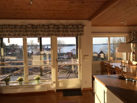 Wonderful wooden deck around the larger part of the house, which offer possibilities fro sunshine (or shade if one prefer) from morning to evening. Garden furniture and mobile parasoll available. As is a cole barbeque. The patio to the North West has a roof and offer nice evening sunshine combined with lake view for lovely evening during summer.