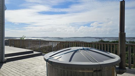 The interior is stylish and functional. The main floor kitchen is fully equipped with a stove, oven, dishwasher, microwave, fridge/freezer, and dining area. From here you have direct access to the terrace with sun all day. On the upper floor you will find another small kitchen, a living room with sofa bed and TV, and stunning sea views. For your convenience, the house also has a washing machine and a travel cot for babies. Outdoors you can enjoy barbecues, the sea breeze, and magical sunsets over Bohuslän. For extra relaxation, a wood-fired hot tub is available for rent.