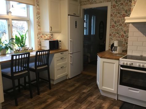 Huset i Boarp har två plan med hemtrevlig inredning. Entréplan: Hall, kök, stort vardagsrum, sällskapsrum med bäddsoffa, sovrum och WC med dusch. Övervåning: tv-rum med bäddsoffa, två sovrum och WC med dusch och tvättmaskin.