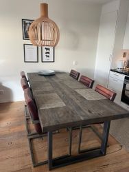 Open kitchen with dining table for 6 people, sofa, 2 armchairs and fireplace.