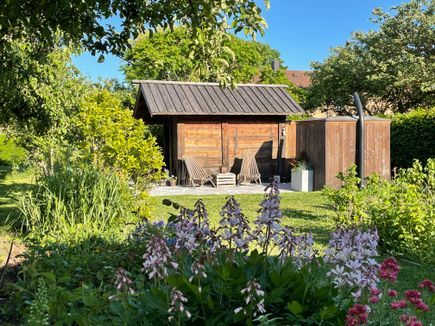 På husets baksida finner ni en lummig trädgård där det finns gott om plats för alla. Här finner ni även flera fruktträd. Uterum med matbord för upp till 10 personer, soldäck med loungesoffa och solstolar, grillplats, studsmatta, fotbollsmål och bastu med utedusch. Här kan ni njuta av frukost, lunch, aktiviteter och sena middagar.