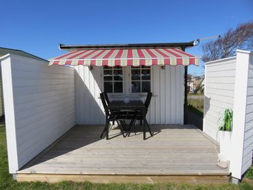 En fin insynsskyddad uteplats med altan och markis. Där man även kan sitta om det mot förmodan skulle regna någon gång.