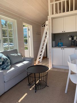 Cozy house of 30 sqm with bedroom, sleeping loft and sofa bed / bedside chair. Total 4 + 1 beds. The cottages are top equipped and have bathrooms with underfloor heating and washing machine, kitchen with oven, coffee maker and fridge with small freezer compartment.