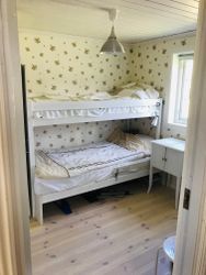 Inside you will find two charming bedrooms; a romantic room with rose wallpaper and bunk beds, wardrobe and chest of drawers and a bedroom with a generous double bed (180 cm) and a wardrobe.