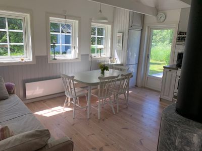 The charming sleeping loft has two 90-beds, but the loft is reached via a steep staircase, perfect for those who are a little adventurous! The bathroom is modern and fresh with a shower, washing machine and stylish interior in tiles and clinker.