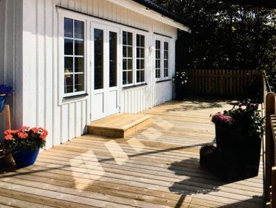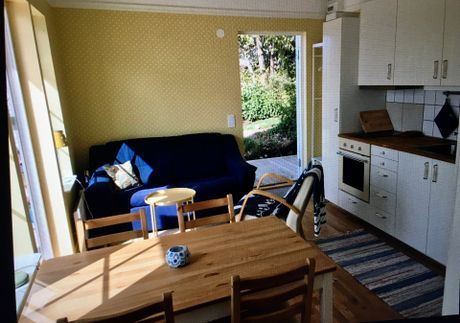 We let our cottage of 25m². The cottage has a private and spacious terrace with a fantastic view over Fjällbackafjorden. A small kitchen, and an all-purpose room (with a sofa bed 120cm.), shower/WC, a cubicle with a double bed together with a loft with two single beds.