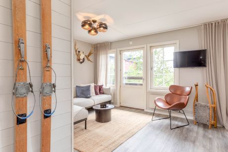 In a unique corner apartment on 61 sqm with view over both the Åre square, slopes, above Hansson Concept Store and Max- you live in the middle of the central heart of Åre. From the entrance its just 50 meter to the enrich lift Åre Bergbana.