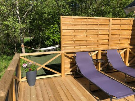 The house has 5 very comfortable beds in two bedrooms and a cozy sleeping loft. Travel cot for the little ones is available to borrow free of charge. In the master bedroom there is a double bed (180cm), wardrobe and sideboard. In the small bedroom there is a single bed and a chest of drawers. In the sleeping loft there are two twin beds and a chest of drawers and a cozy corner. In the living room there is a large soft sofa and a TV with chrome cast. Next to the living room there is a bright open fully equipped kitchen with dining table for 6 people and door to the terrace. The bathroom has WC, shower, sink, washing machine and underfloor heating.