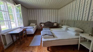 Du bor i två vackert renoverade sovrum i 1700-talsstil. Varje rum med egen dusch och toalett. Du har tillgång till kök för självhushåll och nära till restaurangen som serverar luncher, middagar och fika i parken. Frukost går att förbeställa.